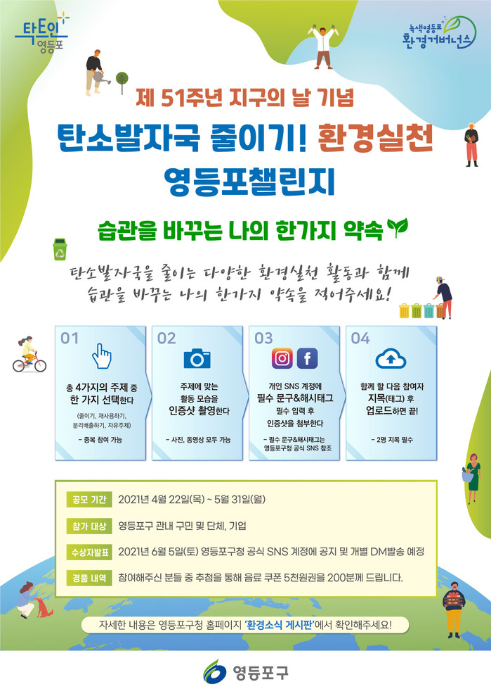 [시민일보 = 여영준 기자] 서울 영등포구(구청장 채현일)가 오는 22일 제51주년 지구의 날을 기념해 ‘탄소발자국 줄이기 환경실천 영등포 챌린지’를 시작한다.