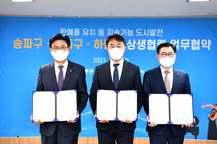 경기 하남시는 4일 서울 송파구·강동구와 ‘지자체간 상생 협력을 통한 지속가능 도시발전을 위한 업무협약’을 체결했다. 이번 협약으로 송파구의 한국예술종합학교 유치를 위해 교통 등 6개 분야에 대해 3개 지자체가 협력하기로 했다. 사진은 협약식에서 김상호 시장(가운데)이 박성수·이정훈 구청장과 기념촬영을 하는 모습. (사진제공=하남시청)