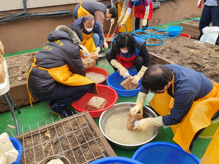 최근 서울 양천구 신정6동 주민센터에서는 전통적인 방법으로 만드는 ‘손맛 품은 나눔 장독대’ 장 담그기가 진행됐다. 이날 만들어진 장은 어려움을 겪고 있는 이웃들에게 전달될 예정이다. 사진은 장담그기 체험을 하고 있는 주민들의 모습. (사진제공=양천구청)