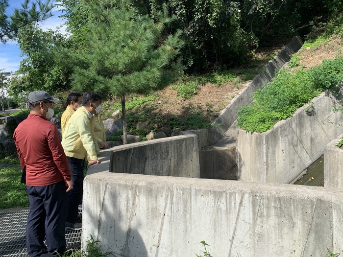 서울 중랑구가 최근 국가안전대진단 기간을 맞아 민간전문가와 함께 합동점검을 실시했다. 이번 점검은 민간전문가와 공무원 등으로 구성된 민관합동점검반이 나선 가운데 재난위험시설인 신내3지구 완충녹지를 중심으로 진행됐다. 사진은 김태희 부구청장을 단장으로 구성된 민관합동점검반이 신내3지구 완충녹지에서 현장점검을 하고 있는 모습. (사진제공=중랑구청)