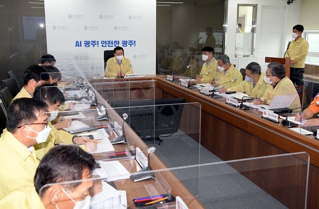 | ▲ 이용섭 광주광역시장이 23일 오전 시청 재난상황실에서 열린 제12호 태풍 오마이스 대비 상황판단회의에 참석해 시민의 안전과 재산피해 최소화를 위해 최선을 다해줄 것을 당부하고 있다. /광주광역시 제공 |