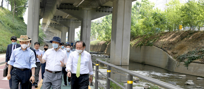 종로·서대문·마포구를 지나 한강으로 흐르는 홍제천을 가꾸기 위해 서대문·종로·마포구청장이 함께 홍제천변 합동 순찰에 나섰다. 사진은 김영종 종로구청장, 문석진 서대문구청장, 유동균 마포구청장(앞줄 왼쪽부터)이 산책로를 걸으며 여러가지 방안을 논의하고 있다. (사진제공=서대문구청)