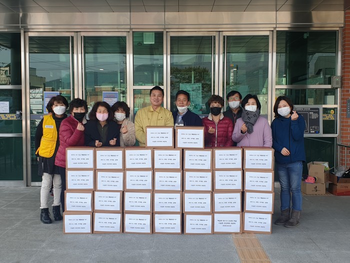경기 남양주 수동면 주민자치위원회가 최근 지역내 취약계층과 자가 격리자를 위한 마스크, 즉석밥, 라면, 사골곰탕 등으로 구성된 코로나19 긴급 생활용품 키트 80개를 제작해 대한적십자와 면사무소에 전달했다. 사진은 관계자들의 기념촬영 모습. (사진제공=남양주시청)