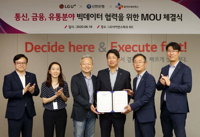 | ▲ 18일 서울시 강서구 소재 LG사이언스파크에서 진행된 ‘통신, 금융, 유통분야 빅데이터 협력을 위한 MOU 체결식’에서 신한은행 이명구 부행장(왼쪽에서 네번째)과 LG유플러스 이상민 부사장(왼쪽에서 세번째), CJ올리브네트웍스 남병수 상무(왼쪽에서 다섯번째) 및 관계자들이 함께 기념촬영 하는 모습 |