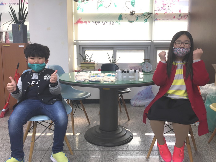경기 안산시 상록구 이동 행정복지센터는 최근 한 초등학생 남매로부터 코로나19 극복을 위한 수제 면 마스크 30개와 손 소독제 25개를 전달받았다. 남매가 기탁한 마스크는 부모님과 함께 직접 제작하고 포장한 것이다. 사진은 남매가 응원의 메시지를 전하며 기념촬영을 하는 모습.(사진제공=안산시청)