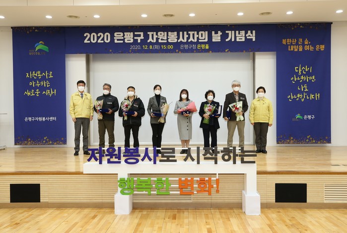 서울 은평구 자원봉사센터가 최근 ‘2020 자원봉사자의 날 기념식’을 개최했다. 올해는 7000시간 이상 봉사활동한 명예의 전당 등재자 4명에게 기념패를 수여하고 우수봉사자 23명에게 표창장을 전달했다. 사진은 기념식에서 김미경 구청장(오른쪽)이 수상자들과 기념촬영을 하는 모습. (사진제공=은평구청)