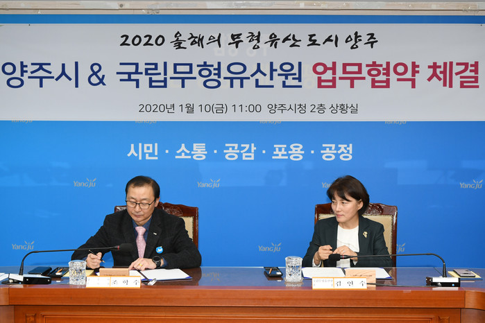 경기 양주시는 지난 10일 시청 상황실에서 국립무형유산원과 2020년 올해의 무형유산 도시 선정에 따른 양주 무형유산 활성화와 사업추진을 위한 업무협약(MOU)을 체결했다. 사진은 조학수 부시장 및 김연수 국립무형유산원장이 협약서에 서명을 하고 있는 모습. (사진제공=양주시청)