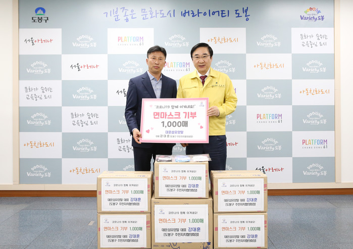 서울 도봉구는 30일 지역내 양말제조업체인 '대운섬유양말'로부터 코로나19 확산 방지와 피해 극복을 위한 150만원 상당의 면 마스크 1000장을 기부받았다. 사진은 이동진 구청장(오른쪽)이 마스크를 전달받은 후 함께 기념촬영을 하는 모습. (사진제공=도봉구청)