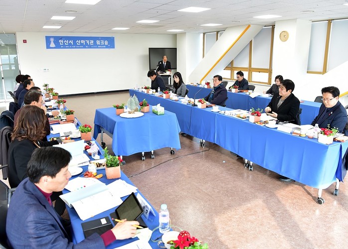 경기 안산시가 최근 시 청소년재단에서 윤화섭 시장을 비롯해 8개 산하기관 대표들이 참석한 가운데 '산하기관 정책 워크숍'을 열고 오는 2020년 핵심사업과 정책방향, 현안 등을 공유하고 전략과 협력 방안을 논의했다. 사진은 토론 진행 모습. (사진제공=안산시청)