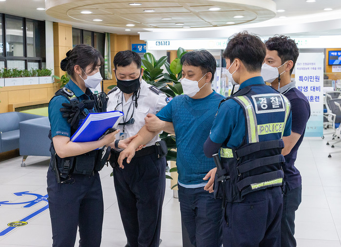 서울 강서구는 22일 ‘특이민원 발생 대비 훈련’을 경찰과 합동으로 진행했다. 이날 모의훈련은 민원처리 과정에서 발생할 수 있는 폭언 등 특이민원으로부터 담당 공무원을 보호하고 안전한 민원환경을 조성하기 위해 실시됐다. 사진은 모의훈련에서 구청 특이민원 대응반이 폭언과 난동을 부린 민원인을 제지하고 있는 모습. (사진제공=강서구청)