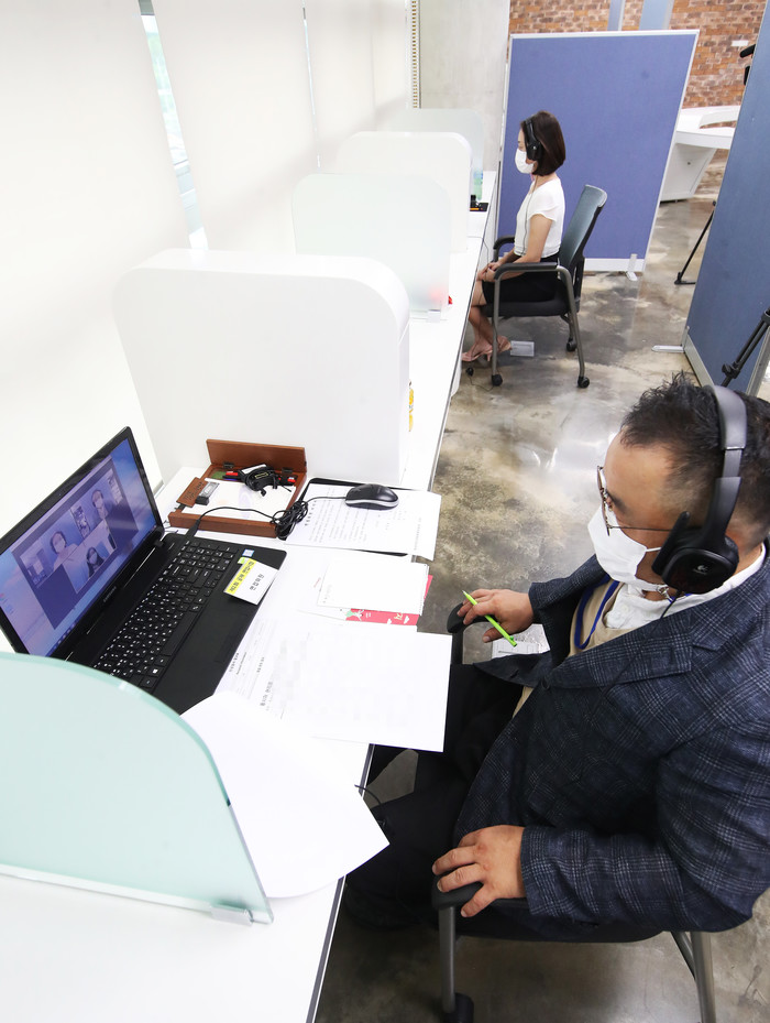 1일 오전 경기 안산시 단원구 안산중앙도서관에 설치된 안산시 공무원 공개경쟁임용 화상면접시험장에서 관계자들이 비대면 면접 시연을 하고 있다.