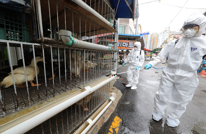 12일 오전 광주광역시 북구 말바우시장에서 북구청 시장산업과 직원들이 조류인플루엔자(AI) 예방을 위해 닭과 오리 판매 업소를 방역하고 있다.
