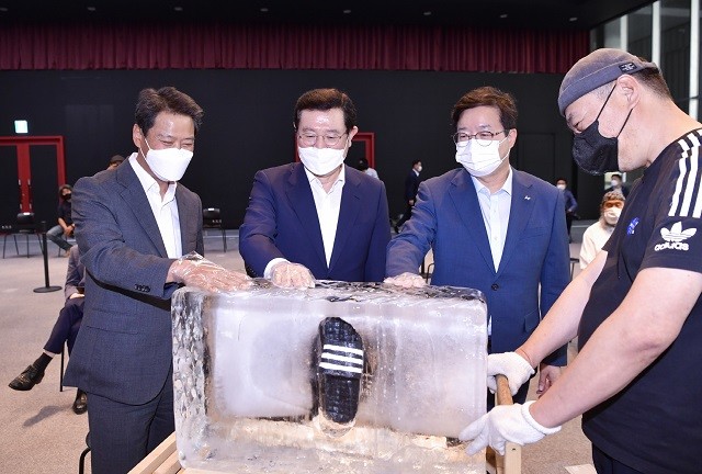 [광주=정찬남 기자] 이용섭 광주광역시장(가운데)이 27일 오후 동구 국립아시아문화전당 문화창조원 국제회의실에서 열린 2021 남북 미술·사진 전시회 '약속' 개막식에 참석해 임종석 (사)남북경제문화협력재단 이사장(왼쪽), 염태영 수원시장(오른쪽)과 얼음을 녹이는 퍼포먼스를 하고 있다. 얼음 안에는 개성공단 노동자들이 주로 신었던 슬리퍼가 담겨 있다.