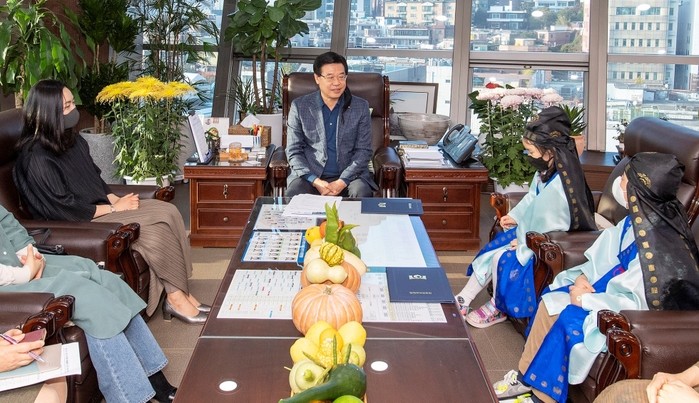 성장현 서울 용산구청장이 지난 2일 구청장 집무실에서 '2020 전국 어린이 고전암송대회' 수상자들을 만나 격려했다. 사진은 성 구청장(가운데)이 수상자들에게 격려를 하는 모습. (사진제공=용산구청)
