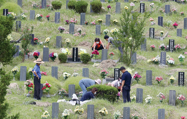 13일 부산 금정구 영락공원에서 성묘객들이 추석을 앞두고 조상 묘를 찾아 벌초하고 있다.