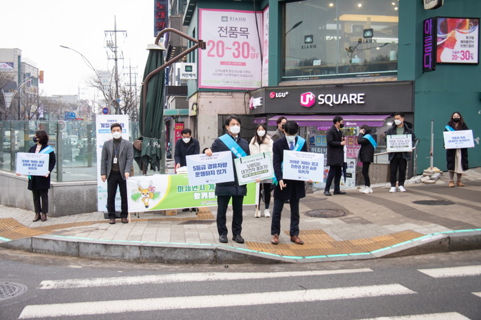 인천 서구가 26일 수도권대기환경청과 함께 구청 앞 사거리에서 미세먼지 계절관리제 홍보 캠페인을 전개했다. 이날 이재현 서구청장을 비롯한 환경청 직원들은 현수막·피켓 등을 활용해 미세먼지 계절관리제의 내용을 알리며 구민들의 참여를 당부했다. 사진은 이날 이 구청장(앞줄 왼쪽)이 피켓을 들고 캠페인에 참여하고 있는 모습. (사진제공=인천 서구청)