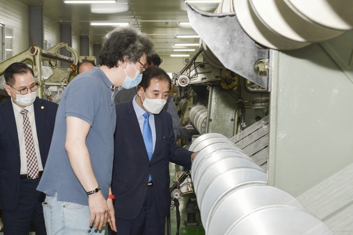 경기 포천시가 21일 지역내 일동면에 소재한 (주)파텍스를 방문해 현장을 살피고 애로사항을 청취했다. 이날 현장 방문에는 박윤국 시장을 비롯해 시의회 의장 직무대리 송상국 부의장, 기업지원과장, 교통행정과장 등이 함께 했으며, 기업애로에 대한 간담회와 공장제조시설 견학 등으로 진행됐다. 사진은 박 시장(오른쪽)이 관계자들과 공장제조시설을 살펴보고 있는 모습. (사진제공=포천시청)