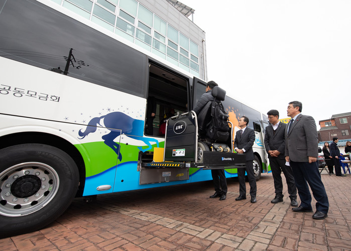 경기 여주시가 28일 시 장애인복지관에서 지역내 장애인들의 외부활동 지원을 위해 도입한 '여강빛버스' 시승 기념식을 개최했다. 이날 행사에는 이항진 시장을 비롯해 관계자 및 장애인 단체 회원 등 70여명이 참석했다. 사진은 시승식 모습. (사진제공=여주시청)