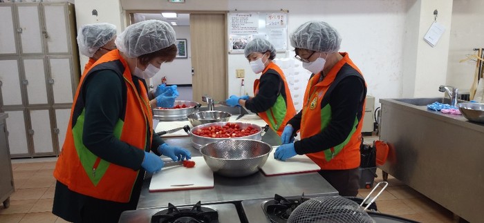 인천 동구 자원봉사센터는 16일 동구여성회관 조리실에서 코로나19로 피해받은 지역 농가와 재난 대응에 수고하는 의료진을 위해 '수제 딸기청 만들기' 활동을 실시했다. 사진은 센터 관계자들이 딸기청을 만들고 있는 모습.(사진제공=동구청)