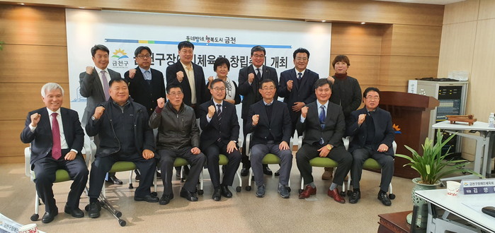 서울 금천구가 지난 23일 구청 소회의실에서 장애인 체육활동 육성지원을 위한 ‘금천구 장애인체육회 창립총회’를 개최했다. 사진은 총회에 참석한 유성훈 구청장 및 관계자들이 기념촬영을 하는 모습. (사진제공=금천구청)