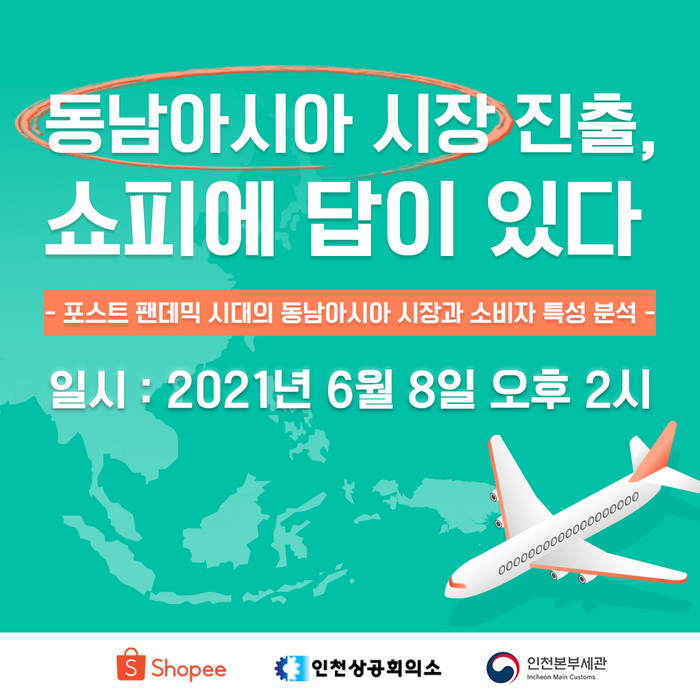 쇼피코리아·인하대학교·인천상공회의소와 함께하는 이번 세미나는 지난 3월 인천세관에서 진행한 동남아 온라인 플랫폼(쇼피) 입점지원 사업의 후속기획으로 평소 동남아 진출에 관심이 있었으나 참여하지 못했던 기업을 위해 누구나 신청할 수 있으며, 동남아시아 전자상거래 시장에 대한 최신동향 및 쇼피 입점방법 등을 소개할 예정이다.