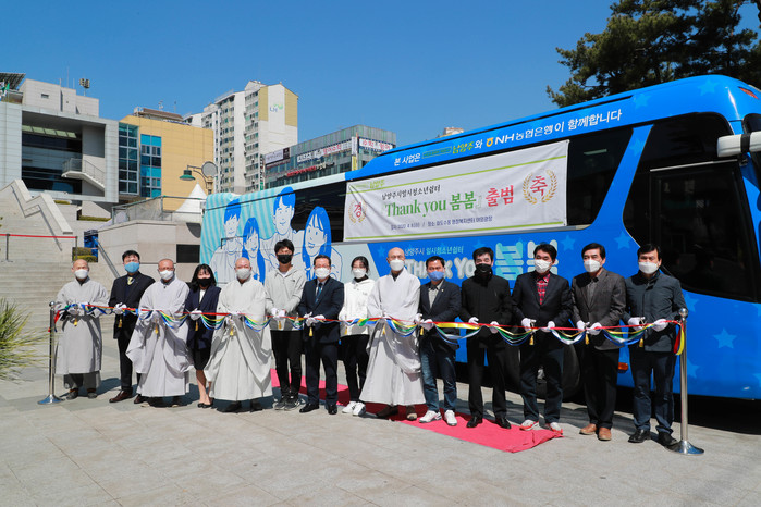 경기 남양주시 일시청소년쉼터는 8일 화도수동행정복지센터 야외광장에서 청소년쉼터 거리상담 버스 ‘Thank you 봄봄’ 출범식을 개최했다. 사진은 조광한 시장(왼쪽에서 일곱 번째)과 쉼터 운영 위탁단체 등 관계자들이 테이프 커팅을 하는 모습. (사진제공=남양주시청)