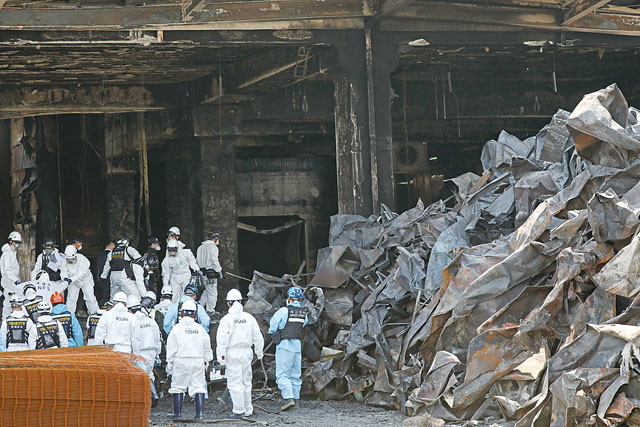 대규모 인명피해가 발생한 경기도 이천시의 한 물류창고 공사장 화재 현장에서 30일 오전 경찰과 국과수 등 관계자들이 합동 감식을 하고 있다.