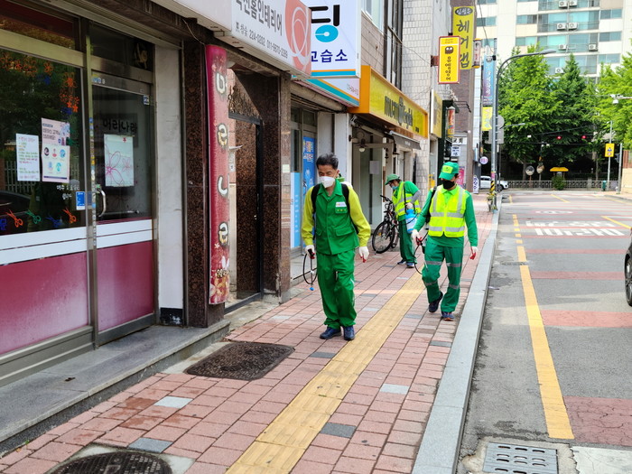 경기 수원시 권선구 권선2동 행정복지센터는 2일 3차 등교개학에 맞춰 집중 방역활동을 실시했다. 이날 방역활동은 권선2동 방역지원반으로 3개조를 구성해 지역내 초·중·고등학교(8곳) 주변상가, 버스정류장, 공중화장실 등 다중밀집장소를 중심으로 진행됐다. 사진은 참여자들이 방역을 하고 있는 모습. (사진제공=권선구청)