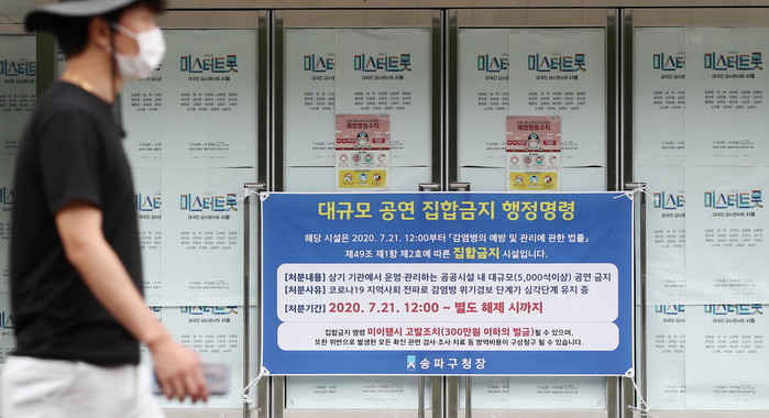 22일 서울 송파구 올림픽공원 체조경기장(케이스포돔)에 '대규모 공연 집합금지 행정명령문'이 붙어 있다. 송파구는 지난 21일 올림픽공원 체조경기장과 핸드볼경기장을 운영하는 국민체육진흥공단에 5000석 이상 대규모 공연 집합금지 명령을 내렸다. 이에 따라 24일로 예정된 '내일은 미스터트롯' 서울 콘서트 개최 잠정 연기됐다.