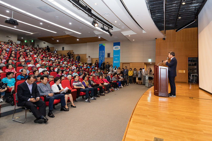 서울 광진구가 23일 건국대학교병원 대강당에서 광진구보건소 치매안심센터 개소 10주년 기념해 ‘치매를 말하다’ 토크콘서트를 개최했다. 사진은 행사에 참석한 김선갑 구청장이 인사말을 하고 있는 모습. (사진제공=광진구청)
