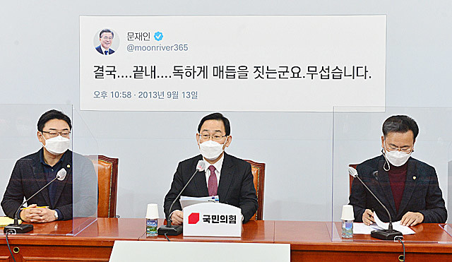 국민의힘 주호영 원내대표가 6일 국회에서 "법무부가 지난해 김학의 전 법무차관을 긴급 출국금지 하기에 앞서 100차례 이상 불법으로 출국 정보를 뒤졌다"라고 주장하며 이 같은 내용의 공익제보를 받은 것과 관련해 긴급 기자회견을 하고 있다.