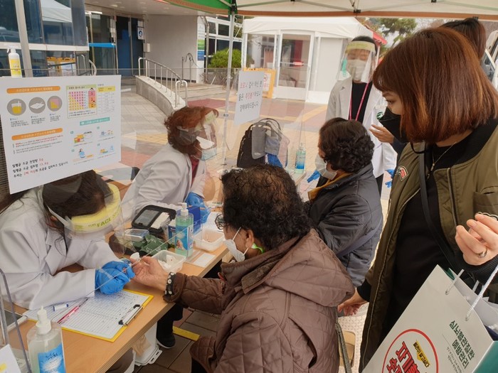 경기 동두천시보건소는 17~18일 이틀 동안 '세계 당뇨의 날'을 맞아 '심뇌혈관질환 예방관리를 위한 캠페인'을 열어 혈당 및 콜레스테롤 무료측정, 체내 염분 테스트를 하고 건강·영양 상담을 제공했다. 사진은 혈당을 측정하고 있는 모습. (사진제공=동두천시청)
