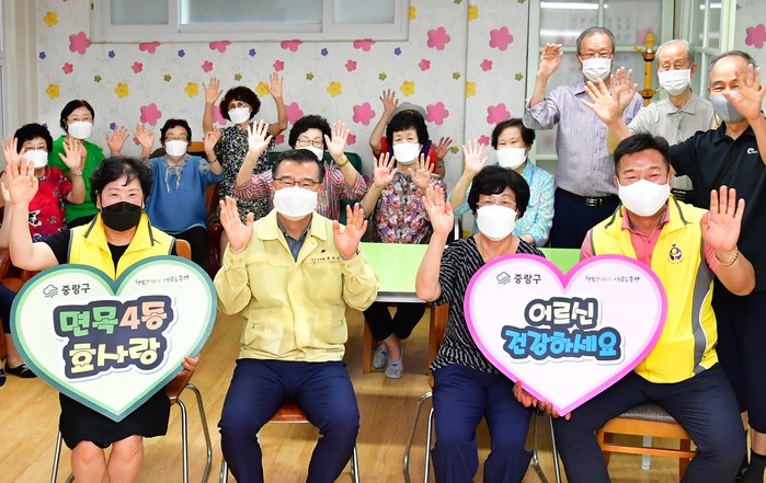 류경기 서울 중랑구청장이 29일 무더위쉼터로 운영 중인 면목4동의 삼호아파트 경로당을 찾아 노인의 안부를 확인하고 코로나19 방역관리 사항 및 냉방기 작동 여부를 점검했다. 점검은 오는 8월2일까지 지역내 사립경로당 12곳을 중심으로 이어질 예정이다. 사진은 류 구청장(앞줄 가운데)이 노인들과 기념촬영을 하는 모습. (사진제공=중랑구청)