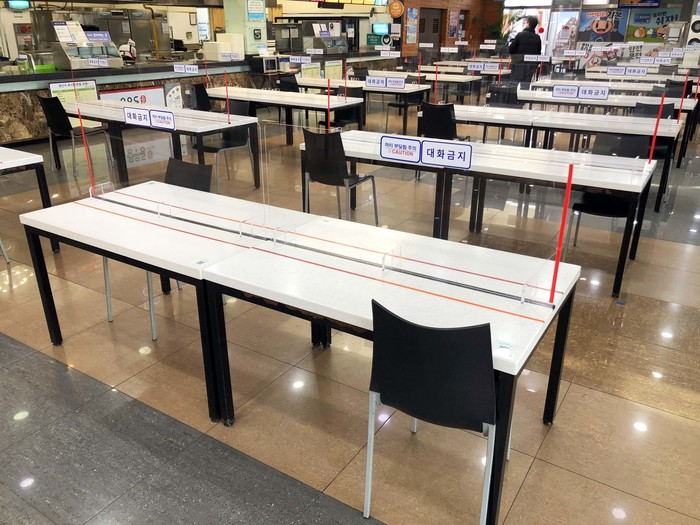 9일 경부고속도로 상행선 경산휴게소 실내 매장에 거리두기를 지킨 의자와 식탁이 설치돼 있다. 하지만 설 연휴 기간에는 모든 고속도로 휴게소 실내 매장에서는 좌석 운영이 금지된다. 대신 테이크아웃은 가능하다.