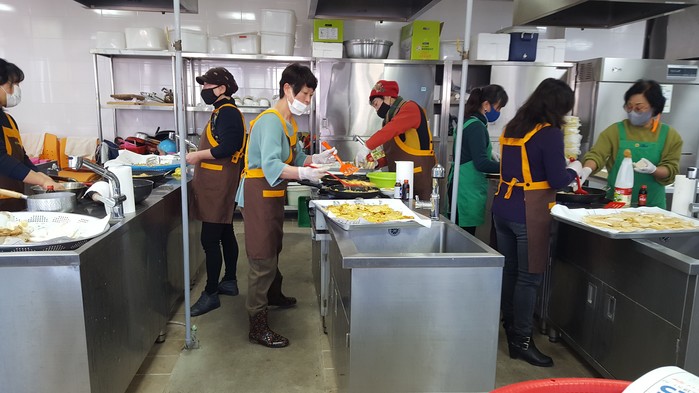 경기 양주시 회천2동 새마을부녀회는 4일 설날을 맞아 취약계층 홀몸노인 31가구를 위한 명절음식 나누기 행사를 진행해 불고기, 동그랑땡, 두부전 등 설 음식을 만들어 전달했다. 사진은 부녀회원들이 정성껏 전을 부치고 있는 모습. (사진제공=양주시청)