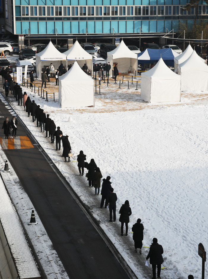 13일 오전 경기 수원시 경기도청에서 직원들이 코로나19 검사를 받고 있다. 경기도는 코로나19 무증상 감염자로 인한 지역감염을 막기 위해 도청과 공공기관 전직원 1만2000여명을 대상으로 13~19일 선제적으로 전수검사를 한다.