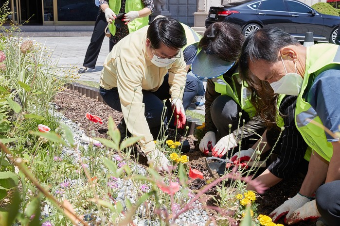 오세현 충남 아산시장이 4일 시민이 직접 계획하고 조성하는 시민정원 조성사업 현장을 방문해 참여자들을 격려하며 함께 꽃 심기를 실시했다. 사진은 오 시장(왼쪽)이 관계자들과 꽃을 심고 있는 모습. (사진제공=아산시청)