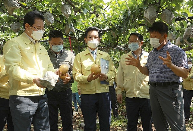 [영암=정찬남 기자] 전동평 영암군수는 김영록 도지사와 함께 지난 27일 영암군 신북면과원동마을 배 재배농가를 찾아 피해를 점검하고 농가를 위로했다.