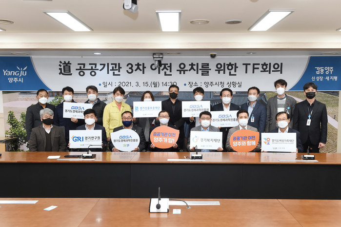 경기 양주시가 경기도 공공기관 3차 이전 계획에 선제적으로 대응하기 위해 15일 공공기관 유치 전담추진단(TF) 1차 회의를 열고 유치당위성 검토, 유치주력 기관 선정, 홍보방안 발굴 등 세부적인 유치전략에 대한 심도있는 논의를 진행했다. 사진은 관계자들이 회의 후 공공기관 이전 유치를 촉구하는 팻말을 들고 기념촬영을 하는 모습. (사진제공=양주시청)