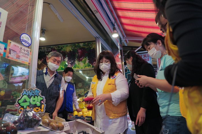 대한적십자사봉사회 경기 구리지구협의회는 지난 14일 코로나19로 얼어붙은 시장경제를 살리고자 구리전통시장에서 장보기 행사를 개최했다. 이날 행사는 대한적십자사 동북봉사관에서 100만원을 후원받아 50인용 밥솥 등 사회복지시설에 필요한 물품을 구매했다. 사진은 이날 관계자들이 물품을 구매하고 있는 모습. (사진제공=구리시청)