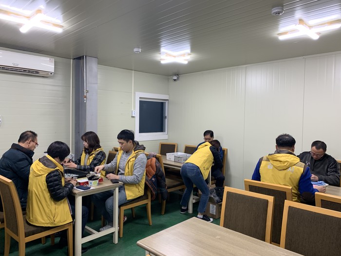 경기 김포시상하수도사업소 직원들이 지난 12~13일 양일간 ‘김포 보경장애인 보호작업장’을 찾아 봉사활동을 실시했다. 이날 직원들은 보경장애인 보호작업장에서 환경정비 및 볼펜조립 등의 직업훈련 작업을 도왔다. 사진은 직원들이 볼펜을 조립하고 있는 모습. (사진제공=김포시청)