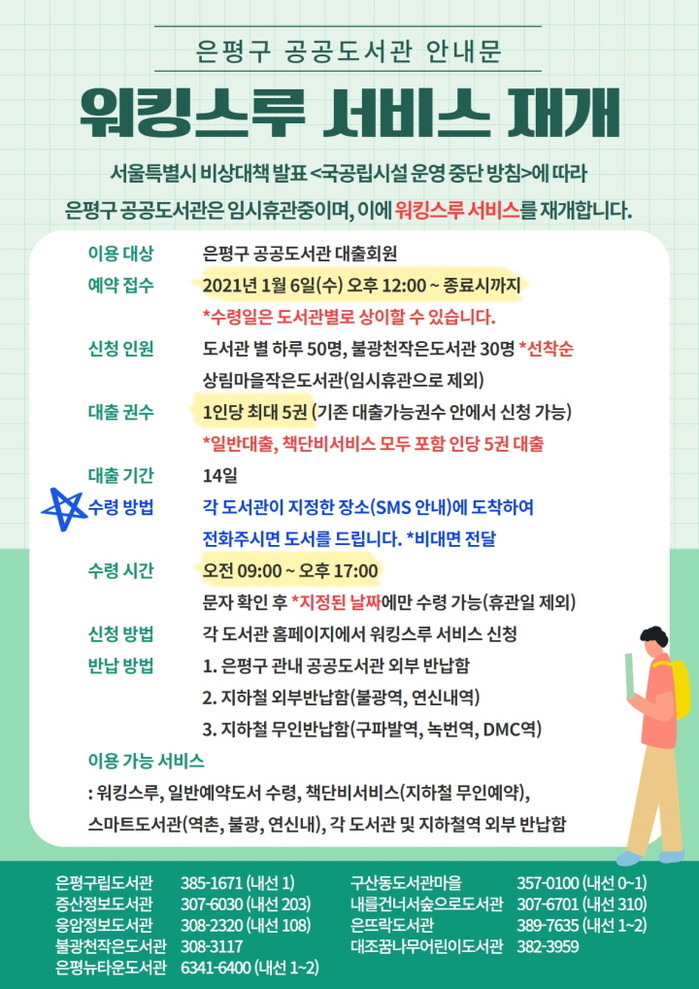 기타 자세한 사항은 은평구 내 공공도서관으로 오전 9시부터 오후 6시까지 문의하면 된다.