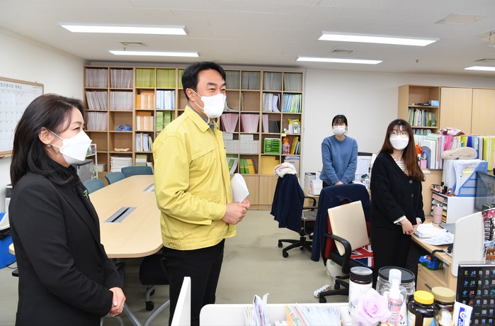김상호 경기 하남시장이 12일 지역내 어린이 단체급식을 제공하는 278개 급식소의 위생과 영양 관리를 지원하는 하남시 어린이급식관리지원센터를 찾아 올해 주요 사업계획을 공유하고 직원들을 격려했다. 사진은 이날 김 시장(가운데)이 센터 직원들을 격려하고 있는 모습. (사진제공=하남시청)