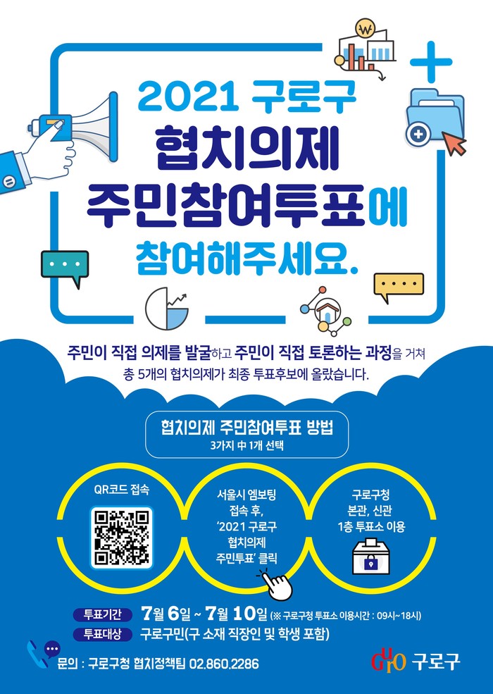 오는 7월6일부터 10일까지 각 의제에 대한 선호도를 조사하는 온·오프라인 주민투표도 진행한다. 투표에는 구로구민 또는 구로구 소재 직장인, 학생이면 누구나 참여할 수 있다. ‘서울시 엠보팅’ 홈페이지를 이용하거나, 구로구청 1층에 마련된 투표소를 방문하면 된다.