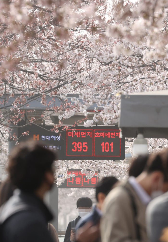 서울지역에 황사 경보와 미세먼지 경보·초미세먼지 주의보가 내려진 29일 오전 서울 여의도 여의나루역 대기 전광판에 미세먼지와 초미세먼지 농도가 표시돼 있다.