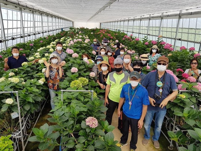 | ▲ 강진군 칠량면 수국재배단지에 위치한 뷰티팜이 2020년 농촌융복합산업 우수사례로 선정돼 코로나19 위기를 기회로 창출한 6차산업 수익모델로 호평을 받고 있다. 사진은 뷰티팜에 선진 화훼재배기술을 익히러 온 수강생들./ 강진군 제공 |