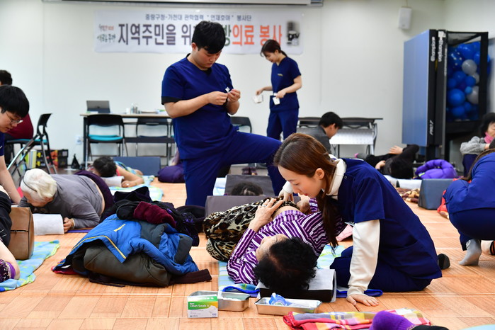 서울 중랑구는 오는 2월14일까지 구청 4층 다목적회의실에서 ‘사랑의 한방진료’를 실시한다. 올해로 18년째 이어지고 있는 사랑의 한방진료는 중랑구와 가천대학교의 관·학 협력사업으로, 저소득층 주민들에게 무료로 한방진료를 제공하는 서비스다. 사진은 '언재호야 봉사단'이 진료대상자의 상태를 살피며 침을 놓고 부항을 뜨고 있는 모습. (사진제공=중랑구청)