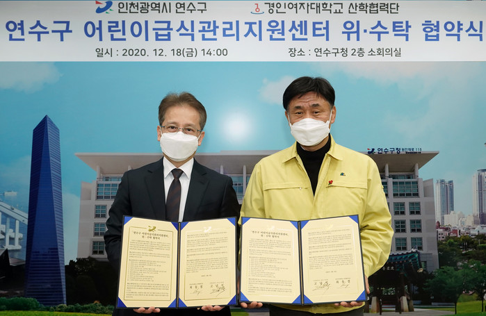 인천 연수구와 경인여자대학교 산학협력단이 최근 연수구 어린이급식관리지원센터 위탁운영 협약을 체결했다. 협약에 따라 경인여대 산학협력단은 오는 2021년 1월1일부터 2023년도 12월31일까지 3년간 구 어린이급식관리지원센터를 운영하게 된다. 사진은 협약 체결 후 고남석 구청장(오른쪽)이 관계자와 기념촬영을 하는 모습. (사진제공=인천 연수구청)