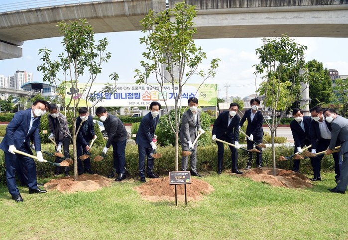 경기 의정부시는 최근 The G&B City 프로젝트의 성공적인 마무리를 기원하고 시청 앞 미니정원 ‘소담길’ 조성을 기념하기 위해 식수 행사를 개최했다. 사진은 이날 행사에 참석한 안병용 시장(왼쪽 다섯 번째)이 관계자들과 함께 산감나무를 식재하고 있는 모습. (사진제공=의정부시청)