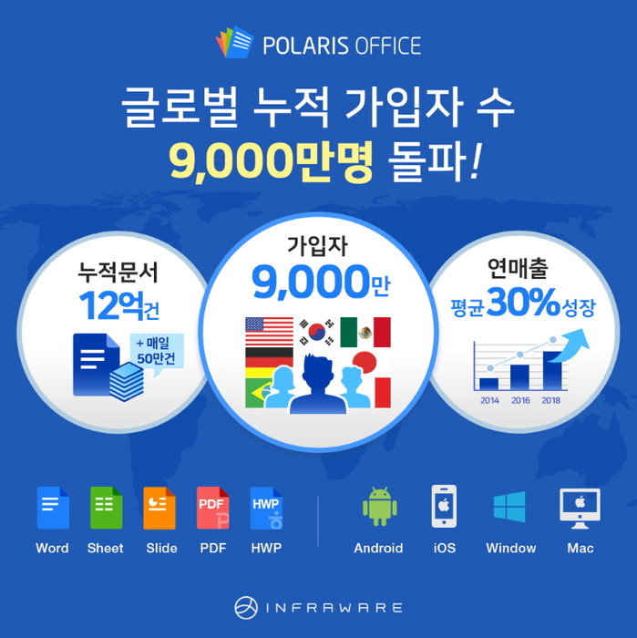 인프라웨어 측은 폴라리스 오피스의 글로벌 누적 가입자 수가 2014년 출시 이후 현재까지 9000만명에 달하는 것으로 집계됐다고 27일 밝혔다.